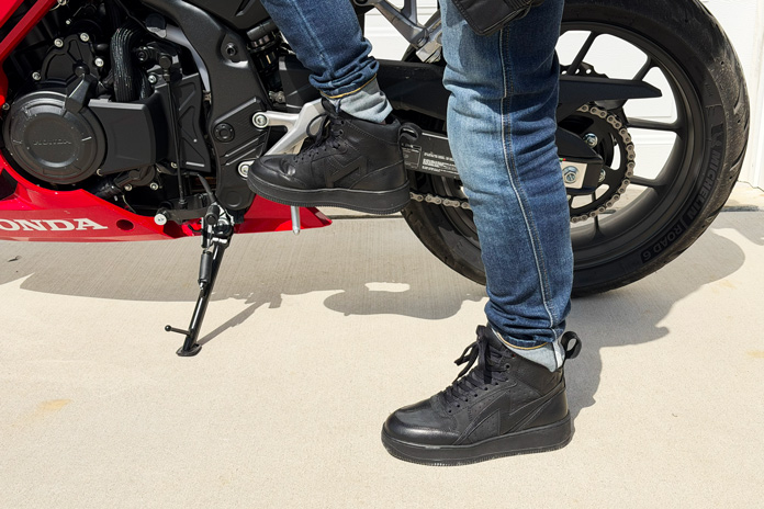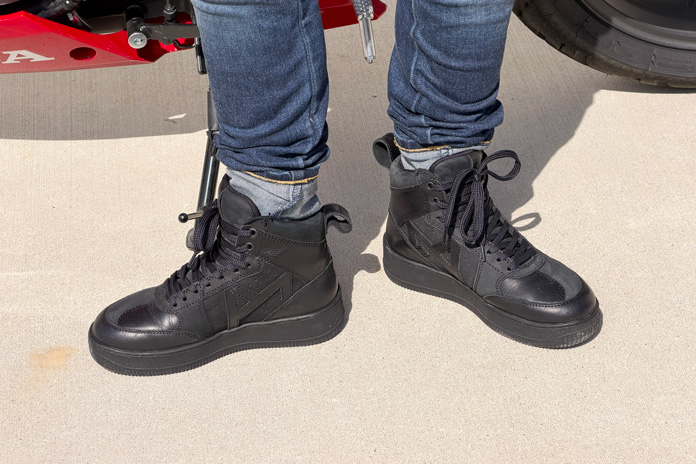 Out of the box, the shoes felt well-made and durable, and they looked exactly as advertised. The lace pattern looks great but is time-consuming to loosen, with the lace weaving into and out of 18 holes. The pair I ordered fit perfectly, but I had to loosen up the lace nearly all the way down to squeeze my foot in. Once I got my foot in them, I found that the squeeze was a trade-off I could live with, as the shoes felt secure and comfortable. Over the course of a handful of riding days, the leather began breaking in, making it easier to get my foot inside them but still requiring more effort than other motorcycle shoes I’ve tested.