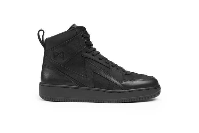 The Apex sneakers are all black with a lightning-bolt-shaped piece of leather on the outer side, the Pando Moto logo in leather on the inner side, high ankles, and an attractive lacing pattern. Their casual-wear appearance nicely complements the style of my Pando Moto cargo jeans beautifully. They’re made of 1.8mm-thick dual-combination full-grain and nubuck leather, and the leather is perforated to provide airflow.