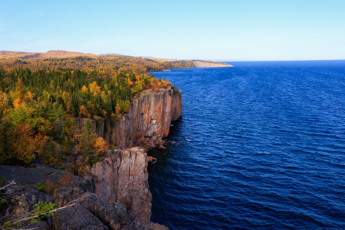 The Palisade Head rock formation, located in Tettegouche State Park on SR-61, rises more than 300 feet above Lake Superior. (Photo by Kali Kotoski)